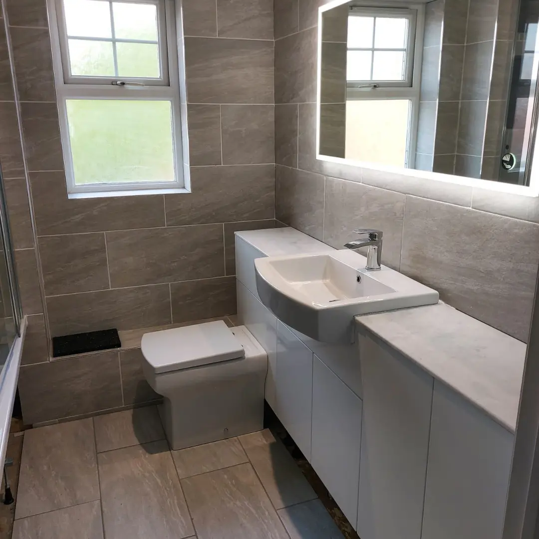 With the installation of this new bathtub and wall-hung shower, we made this bathroom more accommodating for our clients. The room was then treated to a full tiling, including the floors which carried on that soft, warm tone, creating a tranquil atmosphere.